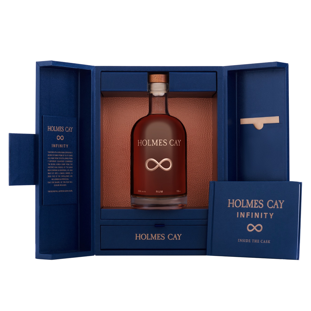 The Holmes Cay Infinity was bottled at cask strength, 58% alcohol by volume. Only 100 full-sized (700 ml) cask strength bottles of this historic offering are available in a boxed set that includes a hardcover book detailing the distilleries and marks which comprise the Infinity cask.